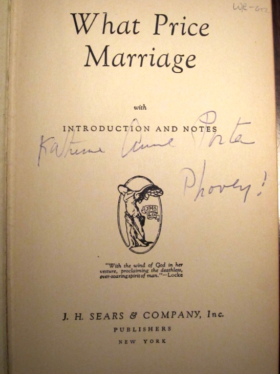 One day a few years ago, a local rare and used books shop owner put a copy of What Price Marriage into my hands for purchase. It’s signed by Porter with the telling comment, “Phooey!” The copy sits on my Ohio bookshelf, far from the legal struggle going on in Maryland. The Washington Post states: “For now, Porter’s legacy is in limbo. The university’s plans to digitize her work are on hold. Who is in charge of granting access to publish her works is uncertain.”